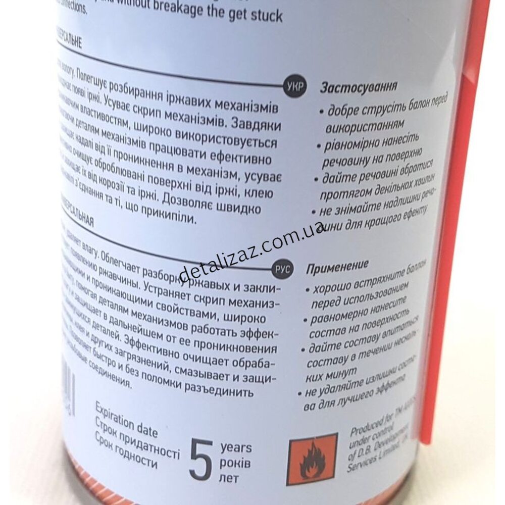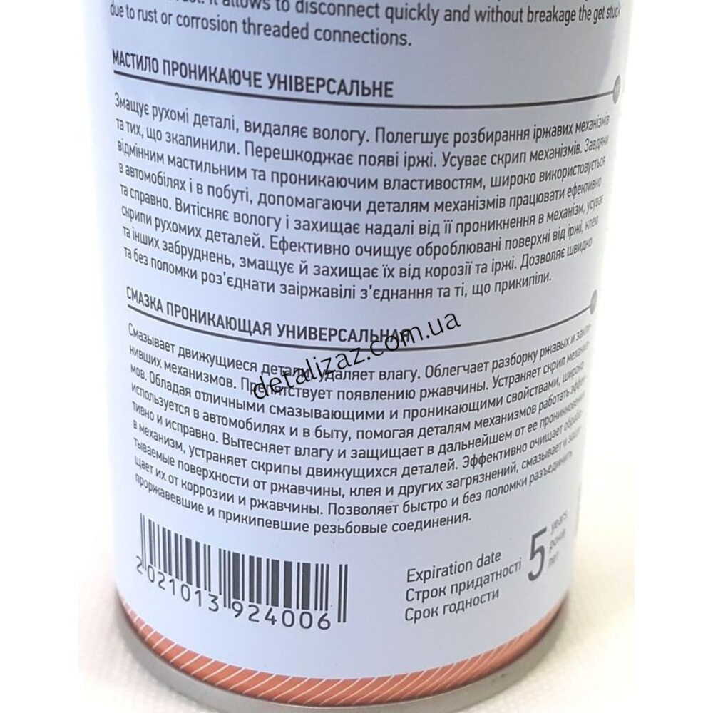 Смазка проникающая универсальная, аэрозоль, аналог WD-40, 250 мл. Смазавает движущиеся детали, удаляет влагу. Облегчает разборку ржавых и заклинивших механизмов. Препятствует появлению ржавчины. Устраняет скрип механизмов. Обладая отличными смазывающими и проникающими свойствами, широко используется в автомобилях и в быту, помогая деталям механизмов работать эффективно и исправно. Вытесняет влагу и защищает в дальнейшем от ее проникновения в механизм, устраняет скрипы движущихся деталей. Эффективно очищает обрабатываемые поверхности от ржавчины, клея и других загрязнений, смазавает и защищает их от коррозии и ржавчины. Позволяет быстро и без поломки разъединить проржавевшие и прикипевшие резьбовые соединения.