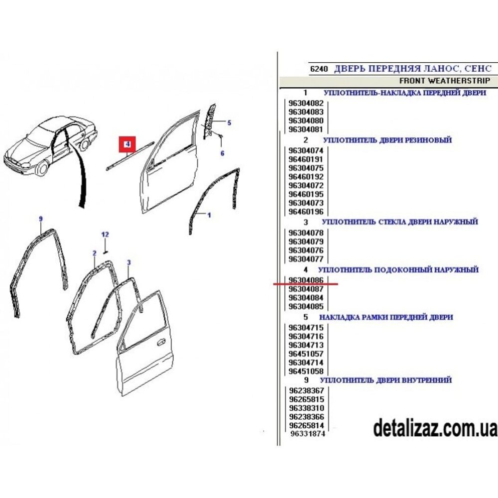 Уплотнитель подоконный передней левой двери Ланос GM 96304086
